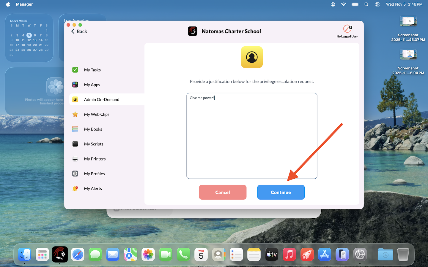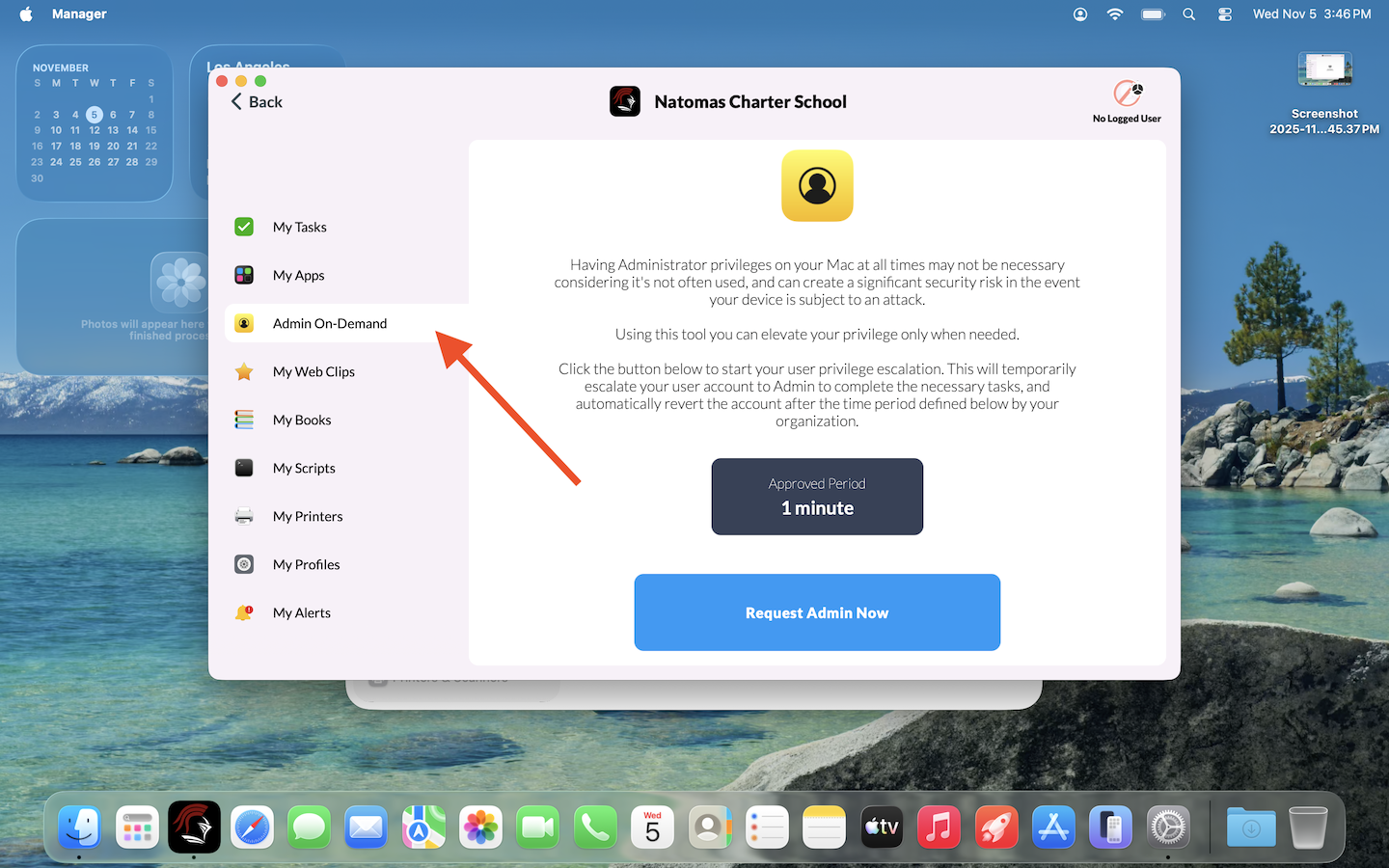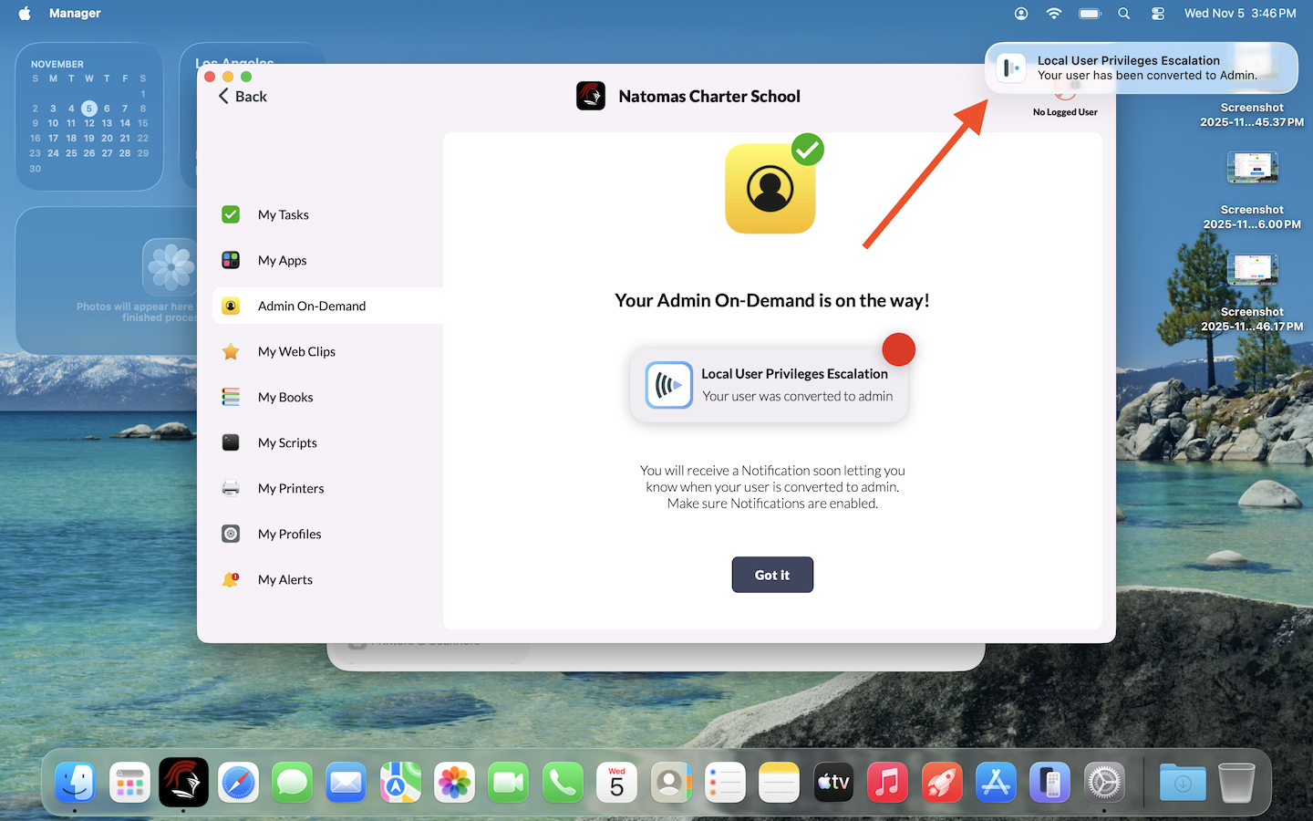 If you need to install custom software or make a change on your computer that requires administrative rights, you can temporarily achieve this by using Mosyle's "Admin-on-Demand" feature.